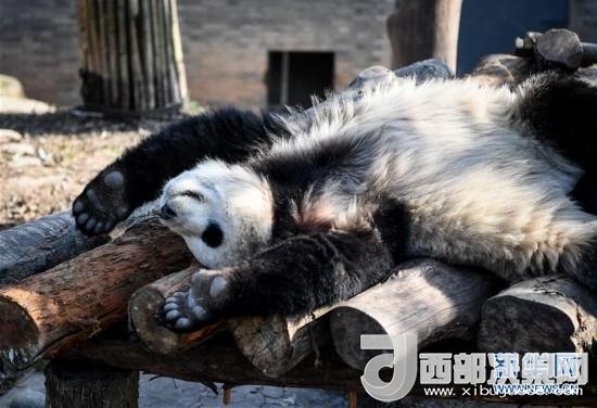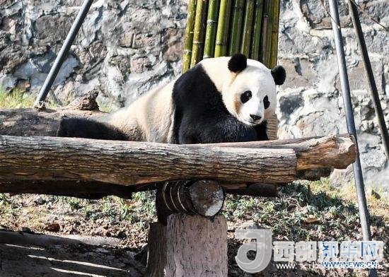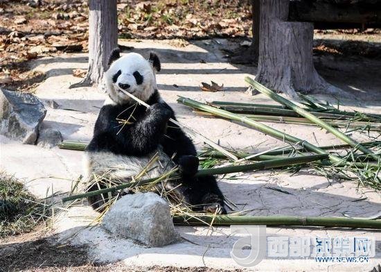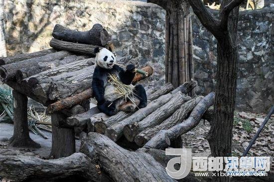 大熊貓盡享冬日暖陽(yáng)品嘗新鮮的竹子