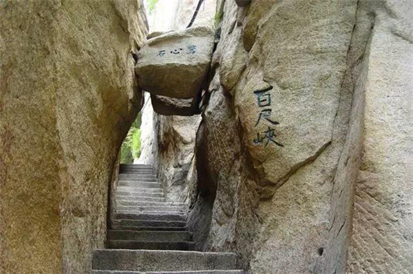 幢去峽復(fù)來,天險(xiǎn)不可瞬。雖云百尺峽,一尺一千仞。”過千尺幢向北折即到“百尺峽”,它也叫“百丈崖”,仍是一處危石聳峙,直插云表,令人望而生畏的地方。峽的兩壁欲合,卻被飛來的兩顆石塊從中撐開,人從石頭下鉆過,膽戰(zhàn)心驚,生怕石塊從兩壁間掉下來,這就是“驚心石”。通過此石懸著的心才放下來,再回頭看原來此處卡著的兩塊石頭,是上大下小故能安然無恙,所以這顆石頭也被稱之為“平心石”。故韓愈詩中有“俄然神功就,殺氣見棱角”的描寫。