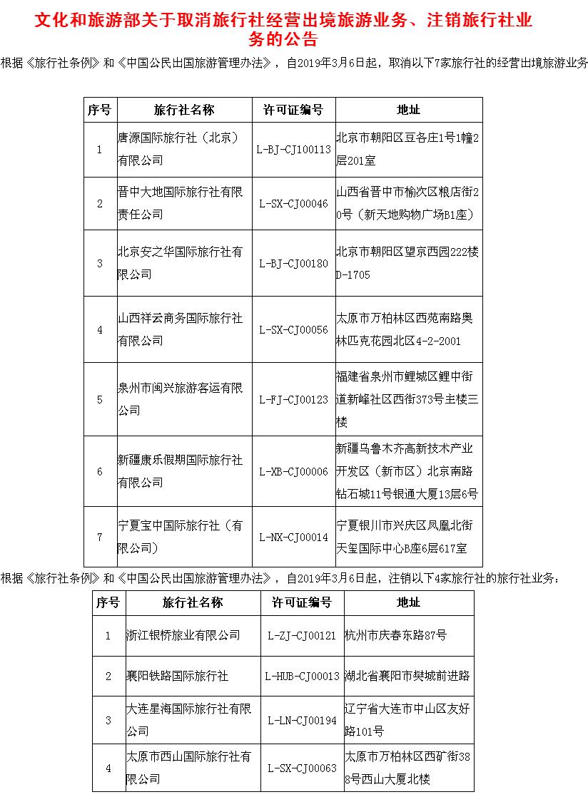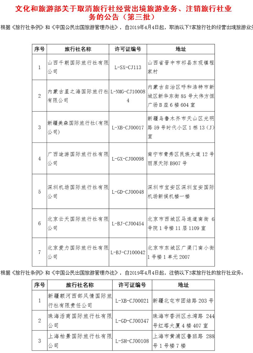 文化和旅游部近日發(fā)布公告,取消7家旅行社的經(jīng)營出境旅游業(yè)務,注銷3家旅行社的旅行社業(yè)務。記者注意到,截至目前,今年文化和旅游部共取消30家旅行社的出境游業(yè)務、注銷11家旅行社的旅行社業(yè)務。戳圖看詳細黑名單。