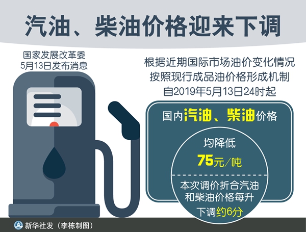 國內(nèi)汽油、柴油價格將迎來下調(diào)。國家發(fā)展改革委13日發(fā)布消息,根據(jù)近期國際市場油價變化情況,按照現(xiàn)行成品油價格形成機制,自2019年5月13日24時起,國內(nèi)汽油、柴油價格每噸均降低75元。