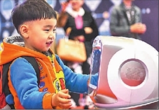 首屆新疆智能產業(yè)博覽會上,小朋友在與一款智能機器人互動。新華社發(fā)