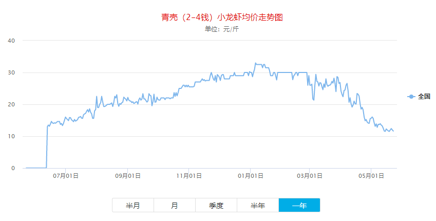 小龍蝦價格網(wǎng)上發(fā)布的全國小龍蝦批發(fā)價走勢圖也顯示,近日價格為一年中的低點,均價在11元上下。