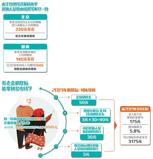 比如,北京市人力資源和社會保障局發(fā)布的調(diào)整方案顯示,養(yǎng)老金按照5%左右的增幅進行調(diào)整后,人均增加220元左右,較去年略有增加;湖南省公布的退休人員養(yǎng)老金調(diào)整方案顯示,養(yǎng)老金調(diào)整后,人均月增加金額為140元左右,比2018年的月人均增加134元,調(diào)整金額略有增加;寧夏決定從2019年1月1日起調(diào)整全區(qū)企業(yè)和機關(guān)事業(yè)單位退休人員基本養(yǎng)老金,其中企業(yè)提高比例為5.5%,機關(guān)事業(yè)單位提高比例為4%,預計全區(qū)共有63.67萬人受益。