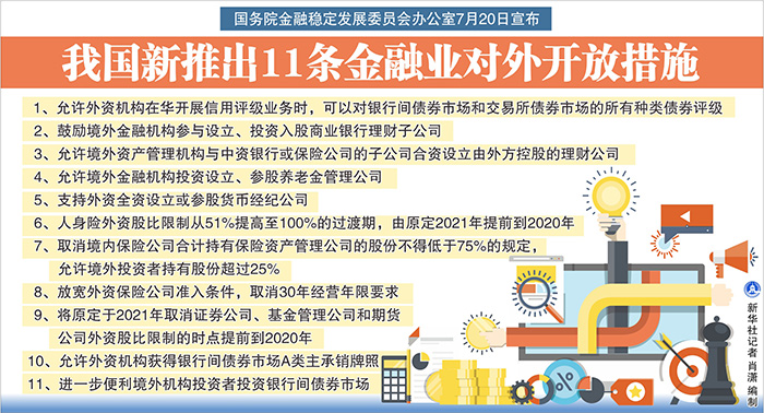 國務(wù)院金融穩(wěn)定發(fā)展委員會(huì)辦公室20日對外宣布,為貫徹落實(shí)黨中央、國務(wù)院關(guān)于進(jìn)一步擴(kuò)大對外開放的決策部署,按照“宜快不宜慢、宜早不宜遲”的原則,在深入研究評(píng)估的基礎(chǔ)上,推出以下11條金融業(yè)對外開放措施: