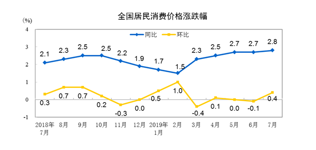 記者從國(guó)家統(tǒng)計(jì)局獲悉,2019年7月份,全國(guó)居民消費(fèi)價(jià)格同比上漲2.8%。其中,城市上漲2.7%,農(nóng)村上漲2.9%;食品價(jià)格上漲9.1%,非食品價(jià)格上漲1.3%;消費(fèi)品價(jià)格上漲3.4%,服務(wù)價(jià)格上漲1.8%。1??—7月平均,全國(guó)居民消費(fèi)價(jià)格比去年同期上漲2.3%。