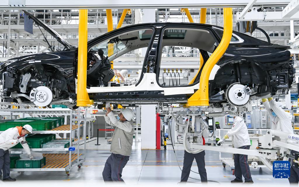 在吉林省長(zhǎng)春市中國(guó)第一汽車(chē)集團(tuán)有限公司紅旗繁榮工廠(chǎng),工人在總裝車(chē)間的生產(chǎn)線(xiàn)上裝配車(chē)輛(2022年10月17日攝)。新華社記者 顏麟蘊(yùn) 攝