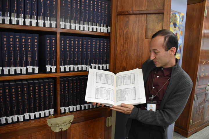 4月20日,一名圖書(shū)管理員在美國(guó)洛杉磯公共圖書(shū)館的中央圖書(shū)館展示《廣州大典》。