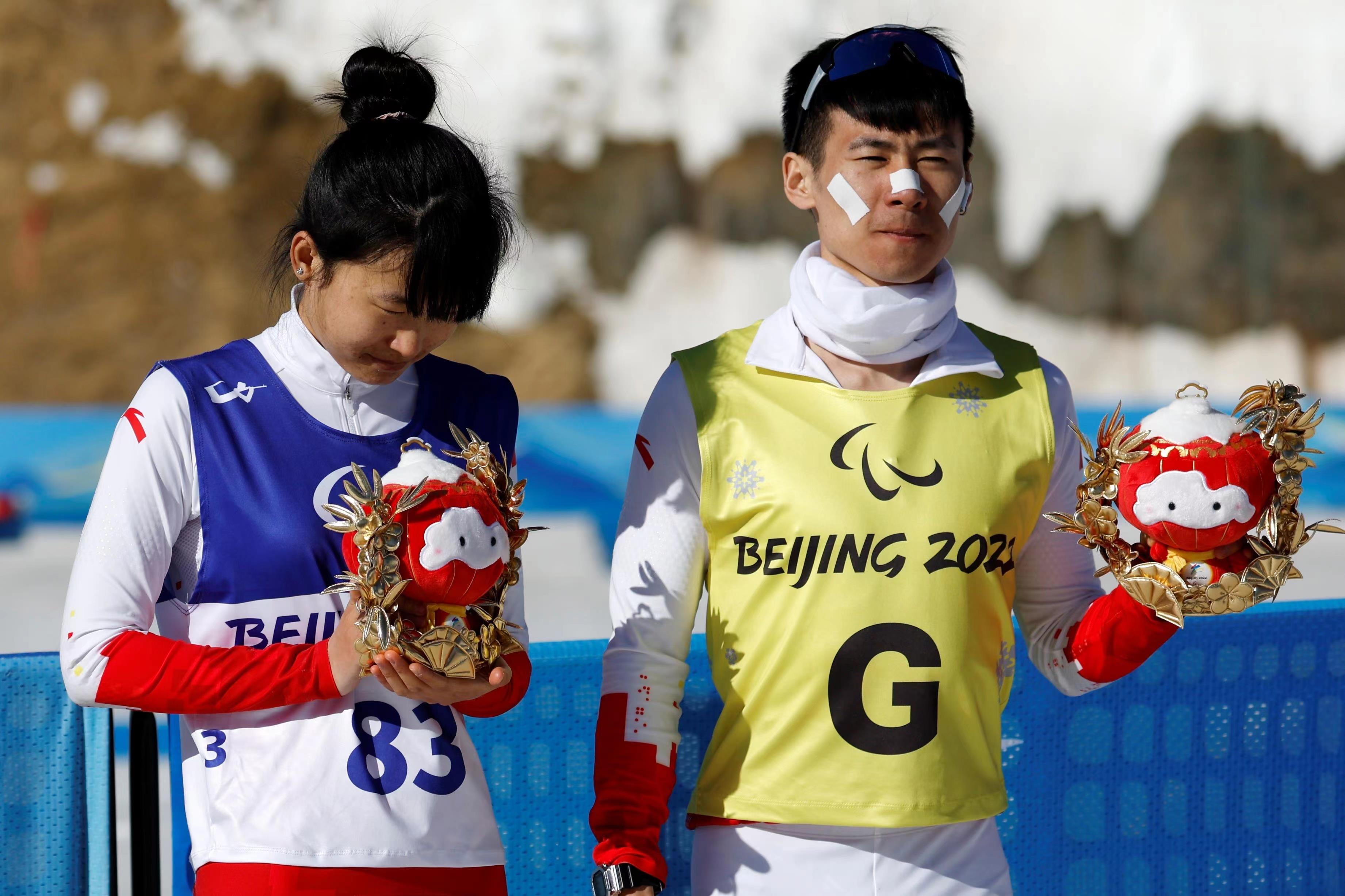 △2022年3月8日,在2022冬殘奧會殘奧冬季兩項女子中距離(視障)比賽中,中國選手王躍(左)獲季軍。