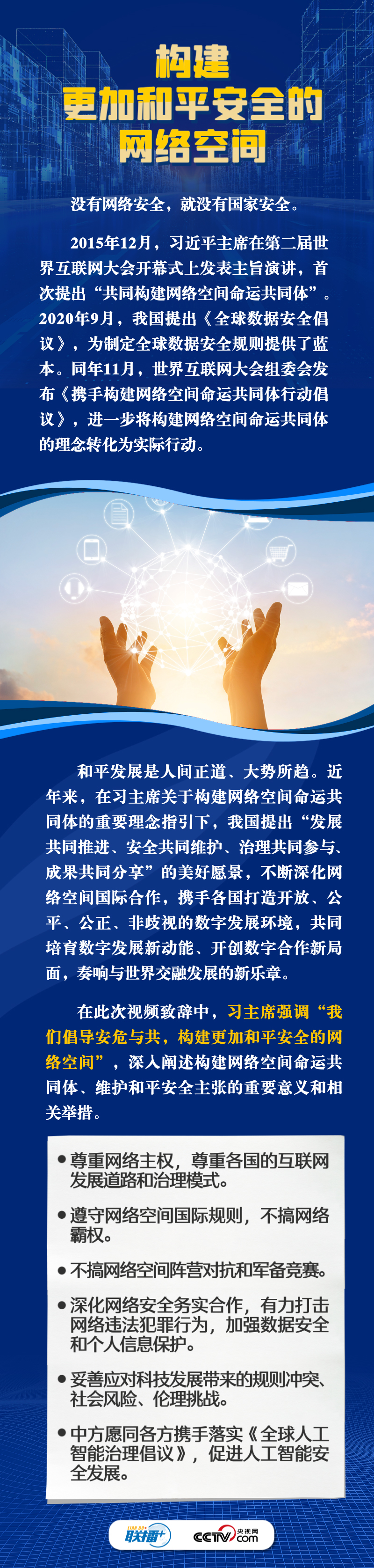 面對新的時代課題,習主席在此次視頻致辭中倡導構(gòu)建更加普惠繁榮、更加和平安全、更加平等包容的網(wǎng)絡空間。這三個“網(wǎng)絡空間”具體內(nèi)容是什么?構(gòu)建網(wǎng)絡“新空間”有什么具體措施?央視網(wǎng)《聯(lián)播+》與您一同學習。