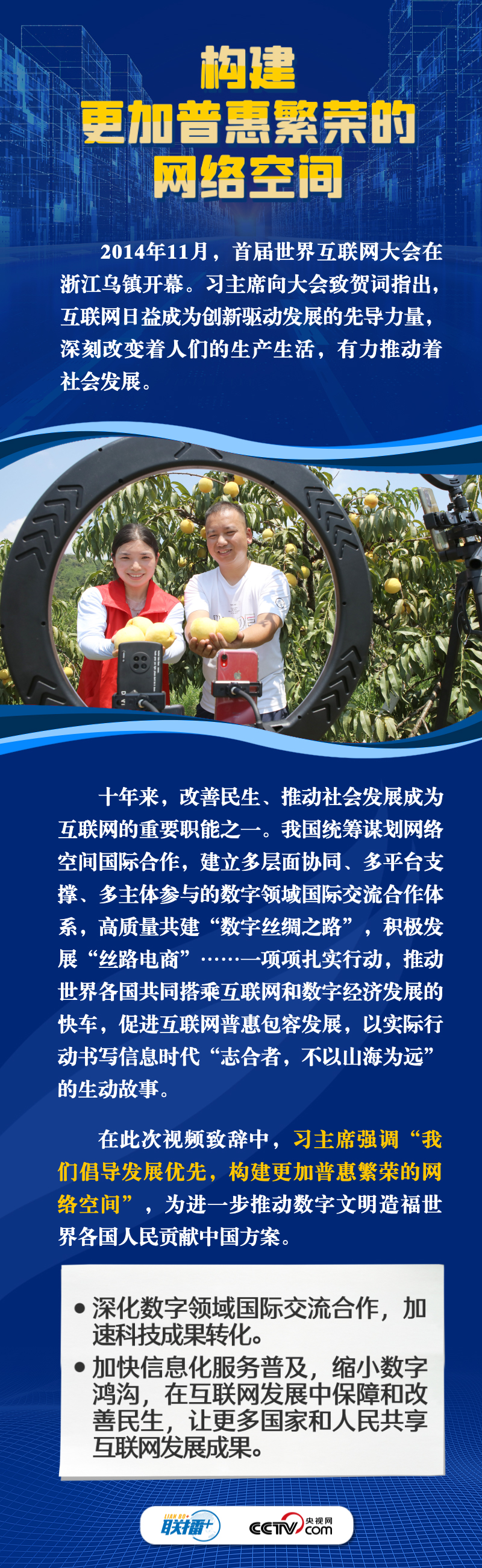 聯(lián)播+ 11月8日,習近平主席向2023年世界互聯(lián)網(wǎng)大會烏鎮(zhèn)峰會開幕式發(fā)表視頻致辭。自2014年首屆世界互聯(lián)網(wǎng)大會舉辦以來,習主席通過發(fā)表主旨演講、視頻致辭或者向大會發(fā)來賀信等不同形式關(guān)心大會的舉辦,始終倡導構(gòu)建網(wǎng)絡空間命運共同體,得到國際社會廣泛認同和積極響應。